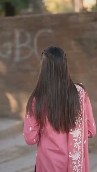 - Blush Rose Festive Wear: A sophisticated pink three-piece suit designed with delicate white threadwork. Key features include a criss-cross detailed neckline, embroidered borders on the sleeves, and a matching dupatta with floral motifs.